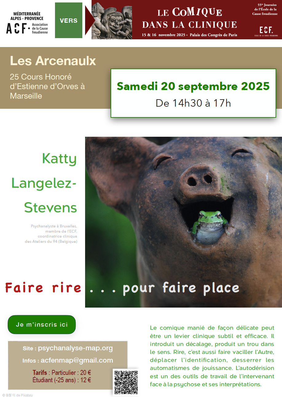 L’ACF en Méditérannée-Alpes-Provence invite Katty Langelez-Stevens, psychanalyste, membre de l’ECF, pour une conférence préparatoire aux J55 « Le comique dans la clinique »