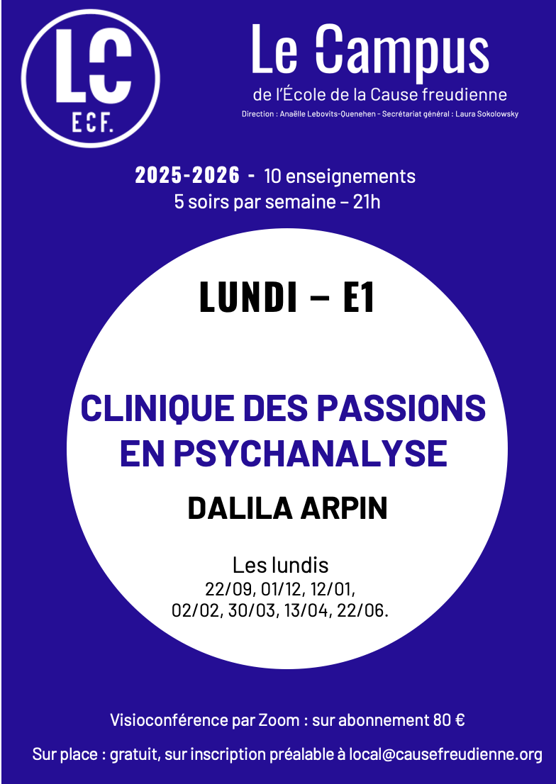 Le névrosé rêve tantôt de vivre la grande passion, tantôt d’atteindre le juste milieu. Le psychotique peut être un idéaliste passionné. Le pervers est contraint de la satisfaire constamment et en court-circuit. Les passions de l’être interviennent à l’entrée en analyse. La fin de l’analyse, terrain solitaire, sans Autre ni garantie, implique-t-elle la fin de la passion? Dès lors, comment cerner les passions dans la clinique? Quel usage dans la cure et quelles solutions seraient envisageables lorsqu’un sujet est aux prises avec une passion dévorante?