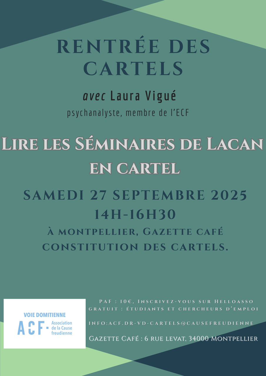 A celles et ceux qui n’ont pas encore fait le pas mais qui le désirent ou qui souhaitent se lancer dans un nouveau cartel, nous vous donnons RDV samedi 27 septembre à Montpellier pour la Rentrée des cartels sous le titre Lire les Séminaires de Lacan en présence de Laura Vigué, psychanalyste, membre de l’ECF à Paris.