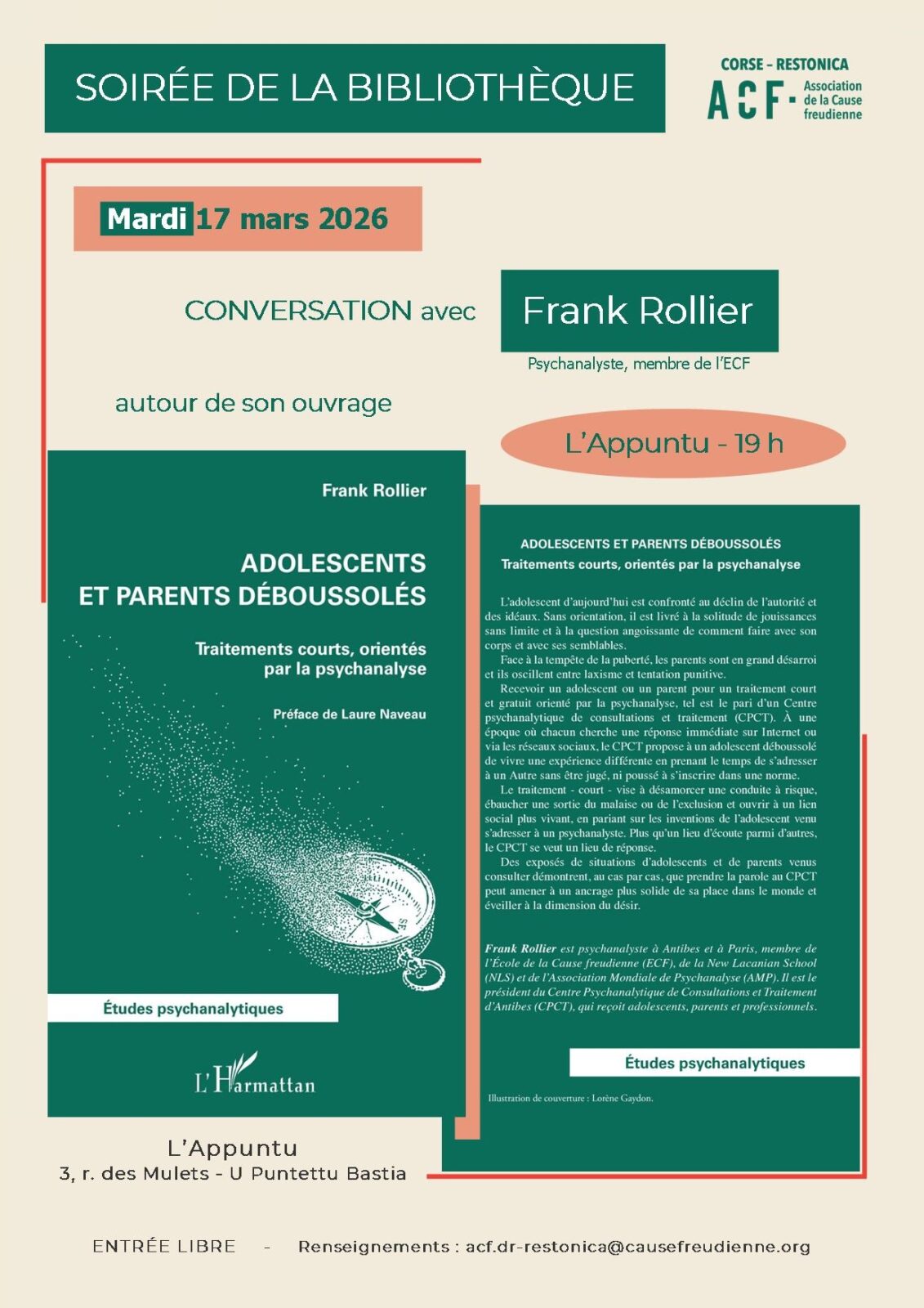 L’ACF Corse – Restonica organise une conversation avec Frank Rollier, psychanalyste, membre de l’ECF, autour de son ouvrage Adolescents et parents déboussolés.