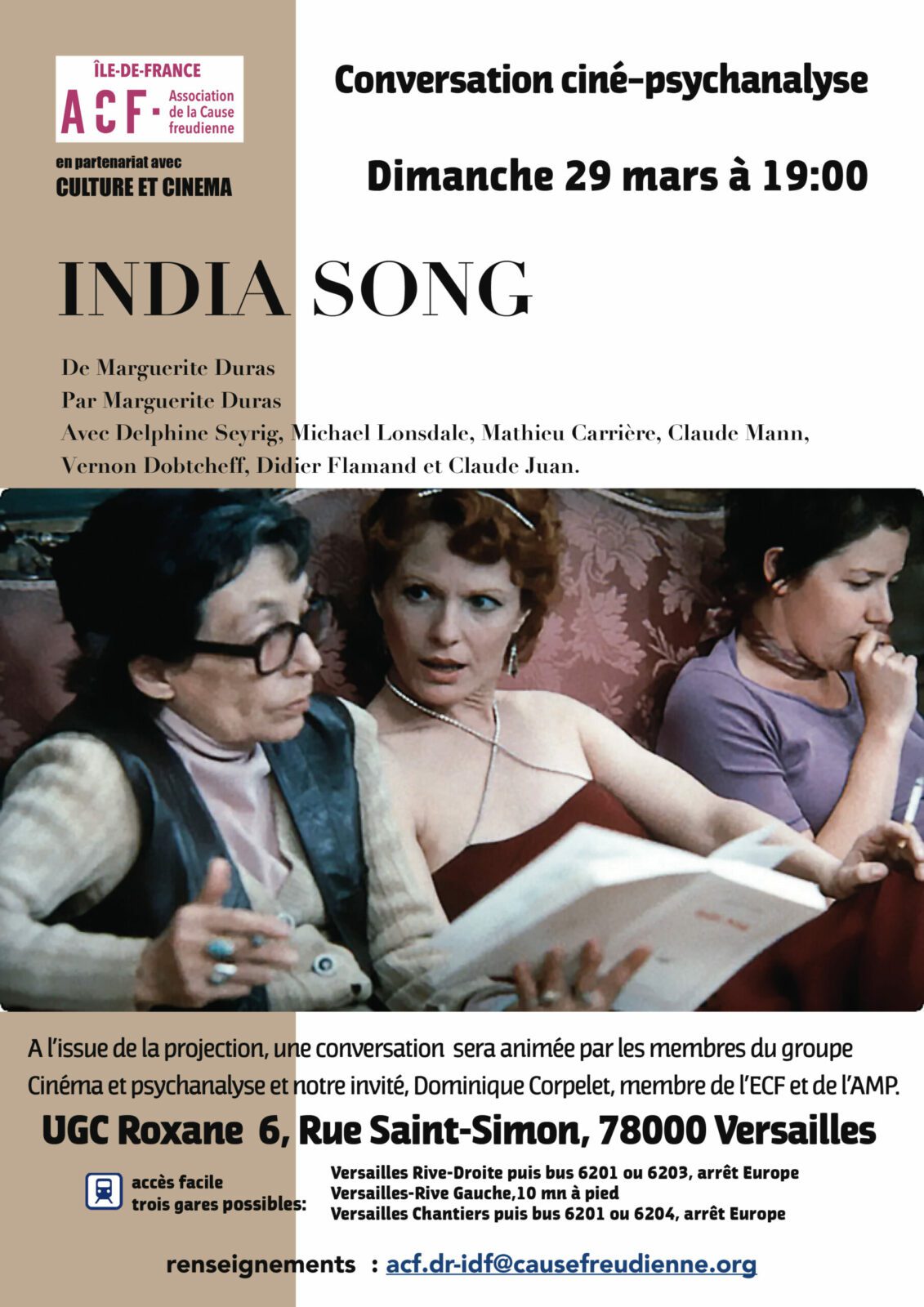 Le groupe Cinéma et Psychanalyse à Versailles animera, le 29 mars, un débat à l’issue de la projection de l’inoubliable India Song de Marguerite Duras.