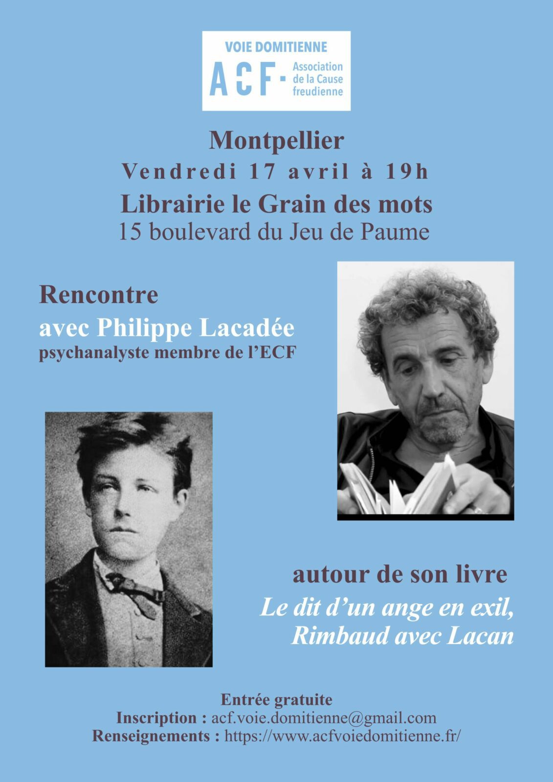 L’Association de la Cause freudienne en Voie domitienne a la joie de vous proposer une rencontre avec Philippe Lacadée, psychanalyste membre de l’ECF et auteur de nombreux ouvrages, autour de son livre Le dit poétique d’un ange en exil. Rimbaud avec Lacan1Lacadée P., Le dit poétique d’un ange en exil. Rimbaud avec Lacan, Paris, La lettre volée, 2025..
